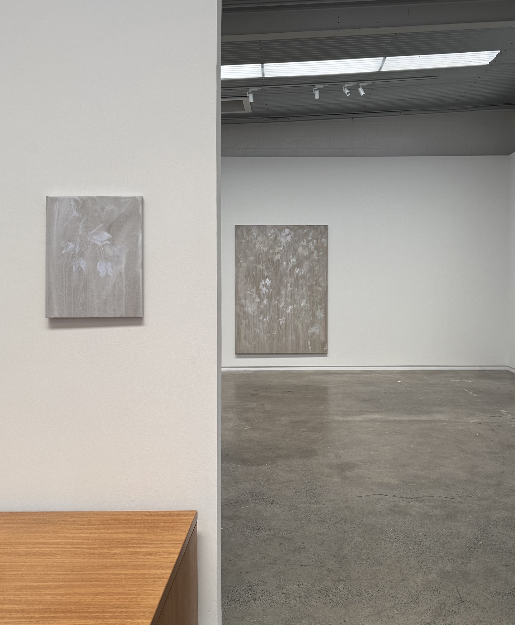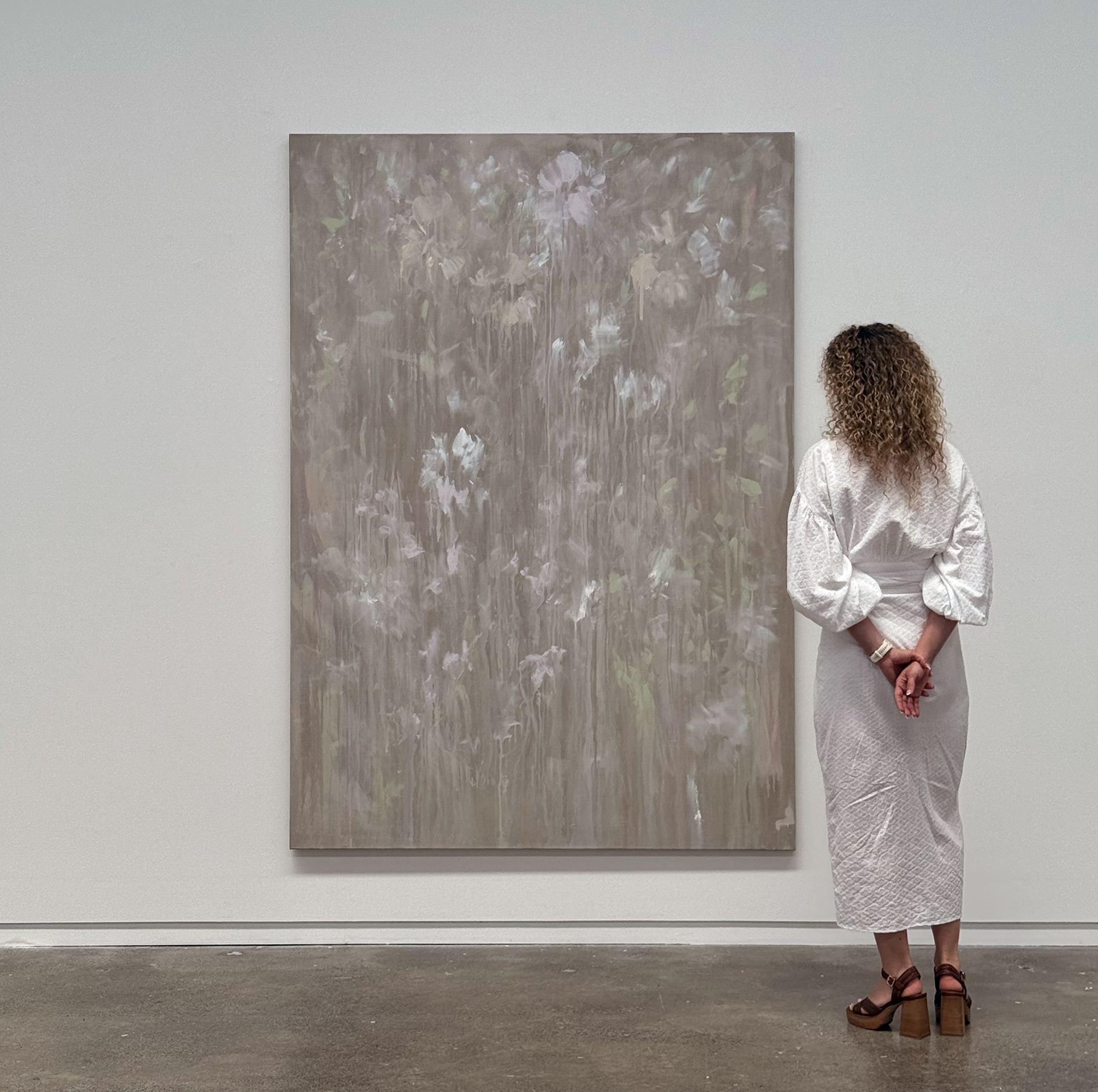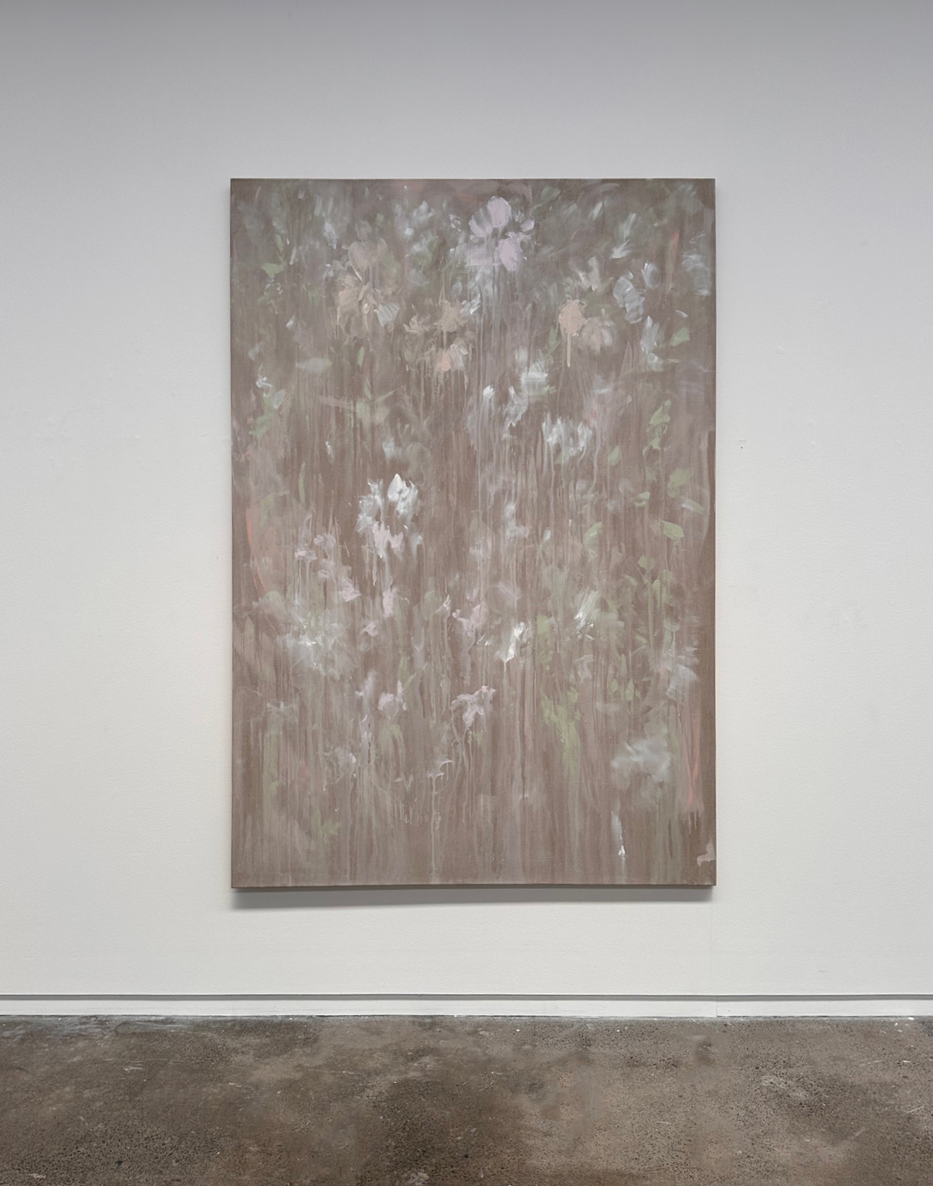 Bianca Raffaella’s paintings exist on the edge of visibility. Elusive, fleeting, dreamlike perhaps. She offers us a hint of physicality. Her blooms are barely there but what they repress in physicality they assert in atmosphere. Pigment brushes up against the linen in soft caresses that insinuate presence and form. Raffaella’s own vision impairment has ironically heightened her sensitivity, and these paintings demonstrate that the tools that we regard as crucial to recognition and apprehension, even sensation – can be substituted for other faculties if only we would close our eyes so as to see..