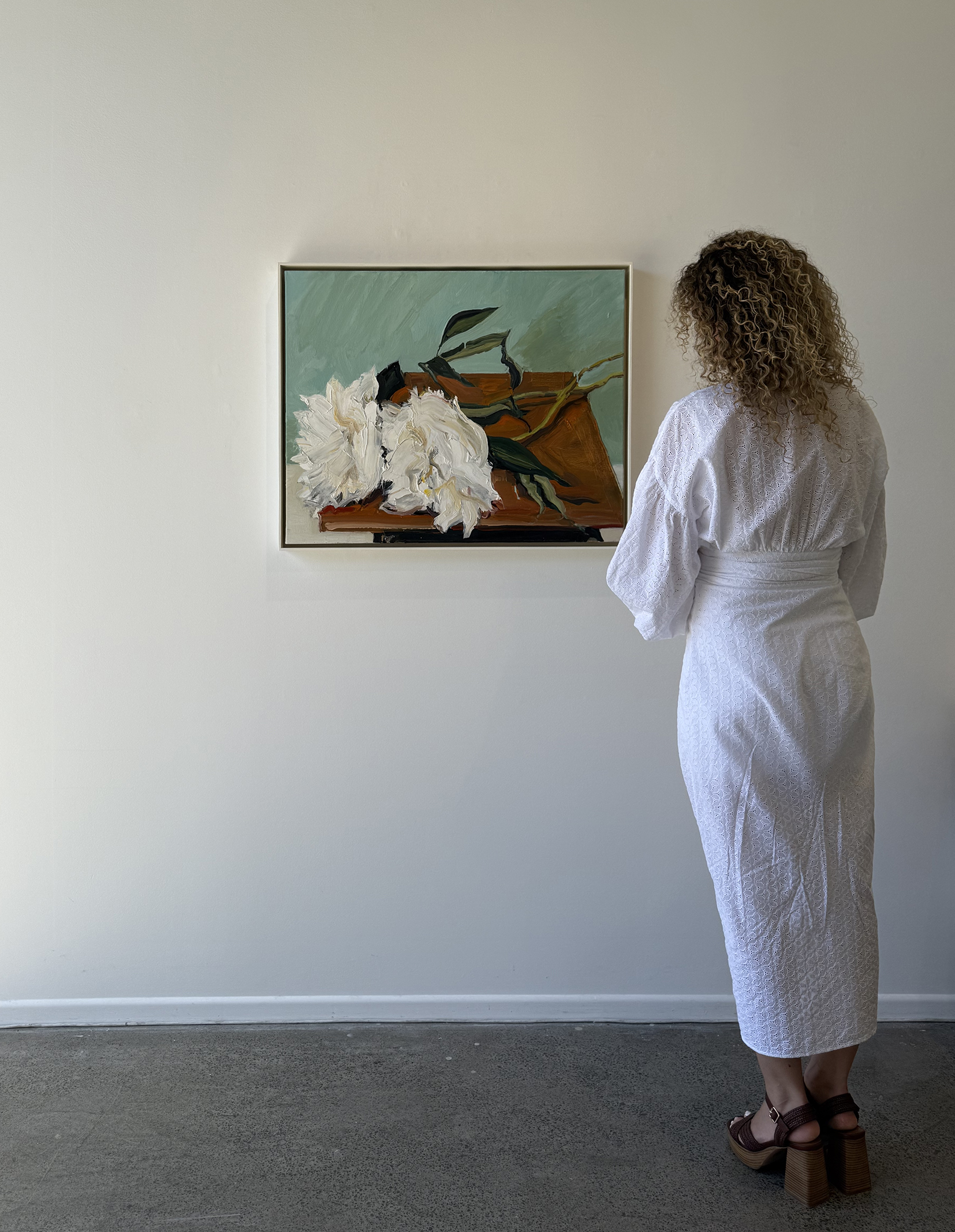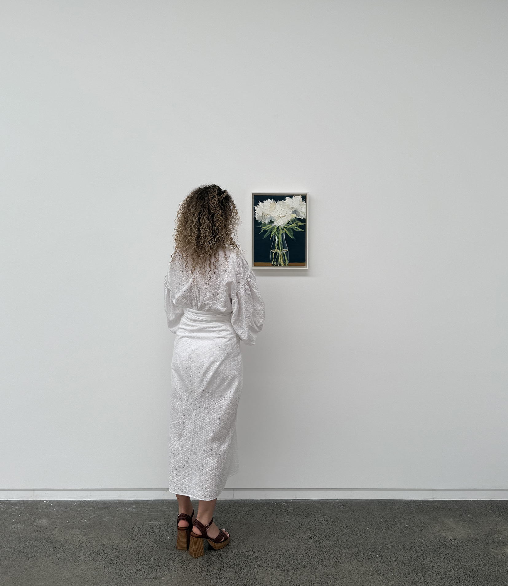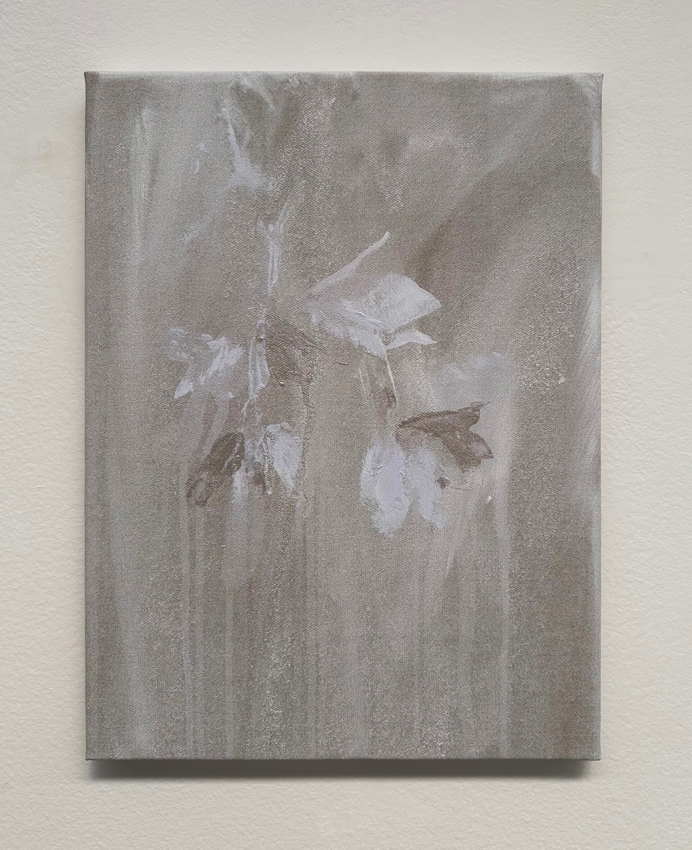 Bianca Raffaella’s paintings exist on the edge of visibility. Elusive, fleeting, dreamlike perhaps. She offers us a hint of physicality. Her blooms are barely there but what they repress in physicality they assert in atmosphere. Pigment brushes up against the linen in soft caresses that insinuate presence and form. Raffaella’s own vision impairment has ironically heightened her sensitivity, and these paintings demonstrate that the tools that we regard as crucial to recognition and apprehension, even sensation – can be substituted for other faculties if only we would close our eyes so as to see..