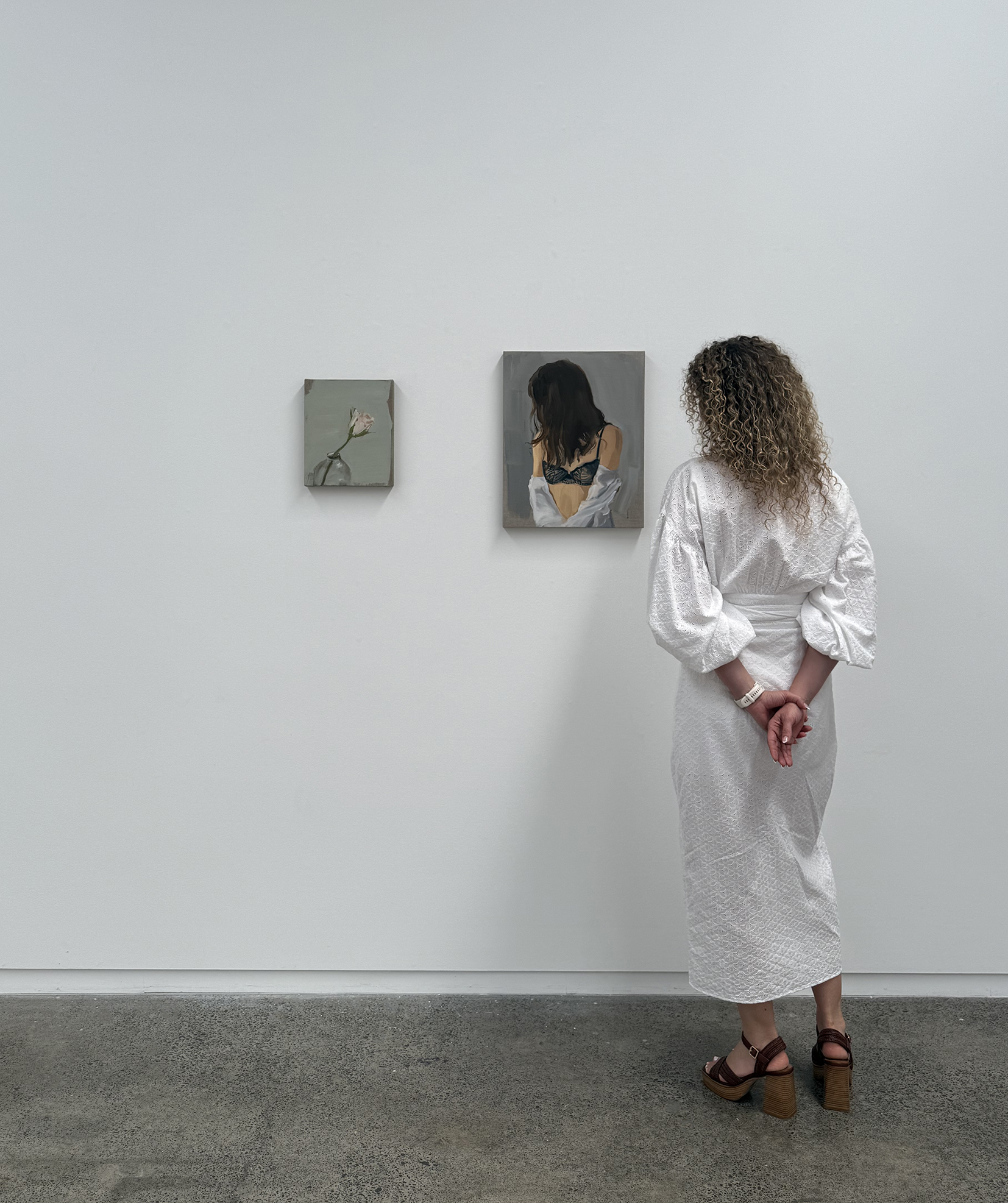 Gideon Rubin’s paintings share something of this understatement though his work is rooted in a knowing and astute description. He is however cautious about the amount of data required, preferring to compress his image making in favour of innuendo. Whether it is a flower, or an isolated figure, Rubin’s observation of deportment is perceptive and discerning. The undemonstrative brushwork that he employs is critical in his determination not to distract, to lead us away from the fundamentally human proposition that he makes evident with each painting. For all of this reductive clarity these are paintings that can seduce us with nostalgia, turn our heads with intimation, quicken our pulse with playful voyeurism; yet their magic lies in Rubin’s ability to make judgements about tone and placement. He and we understand that the success or otherwise depends on these being solved only as paintings.