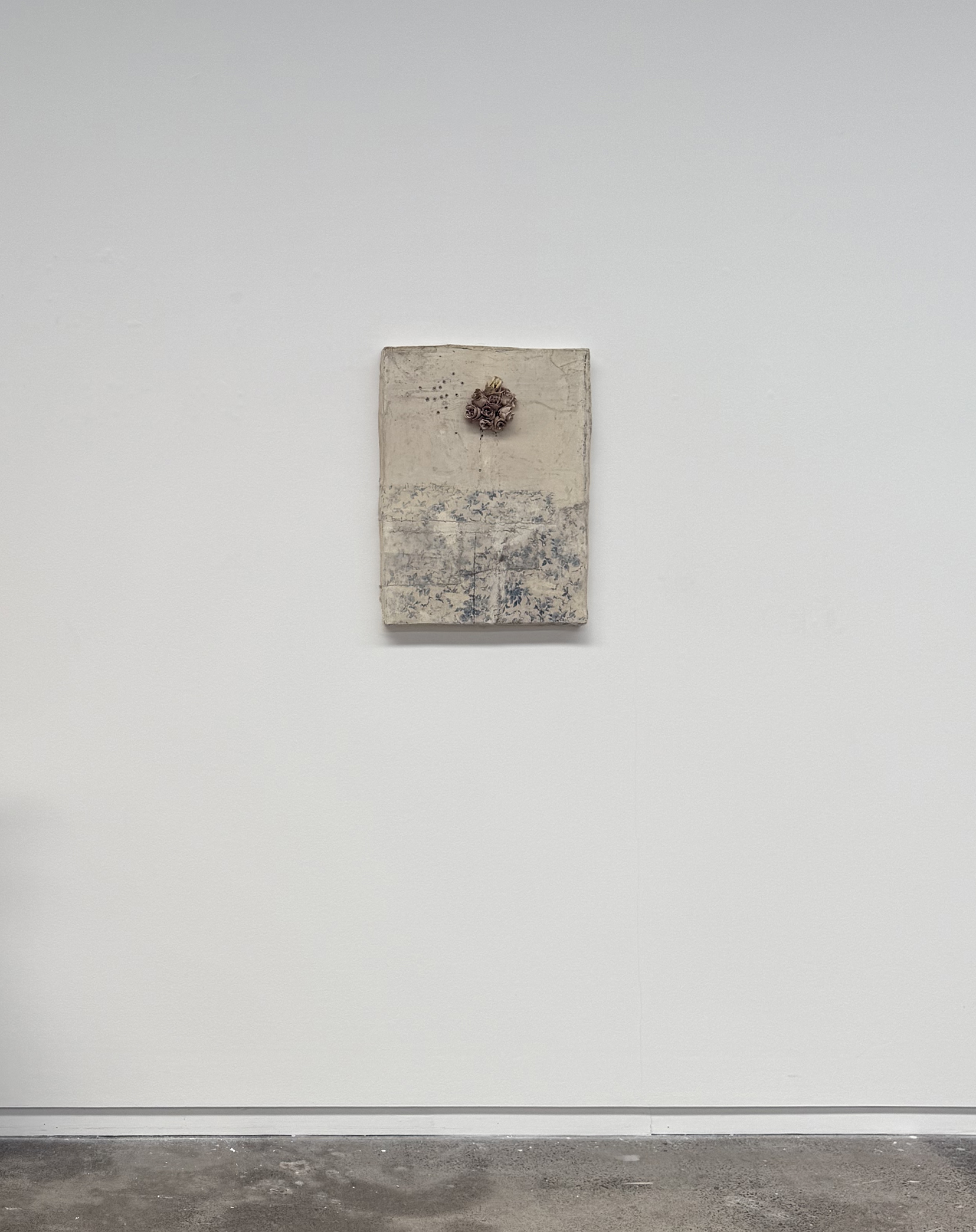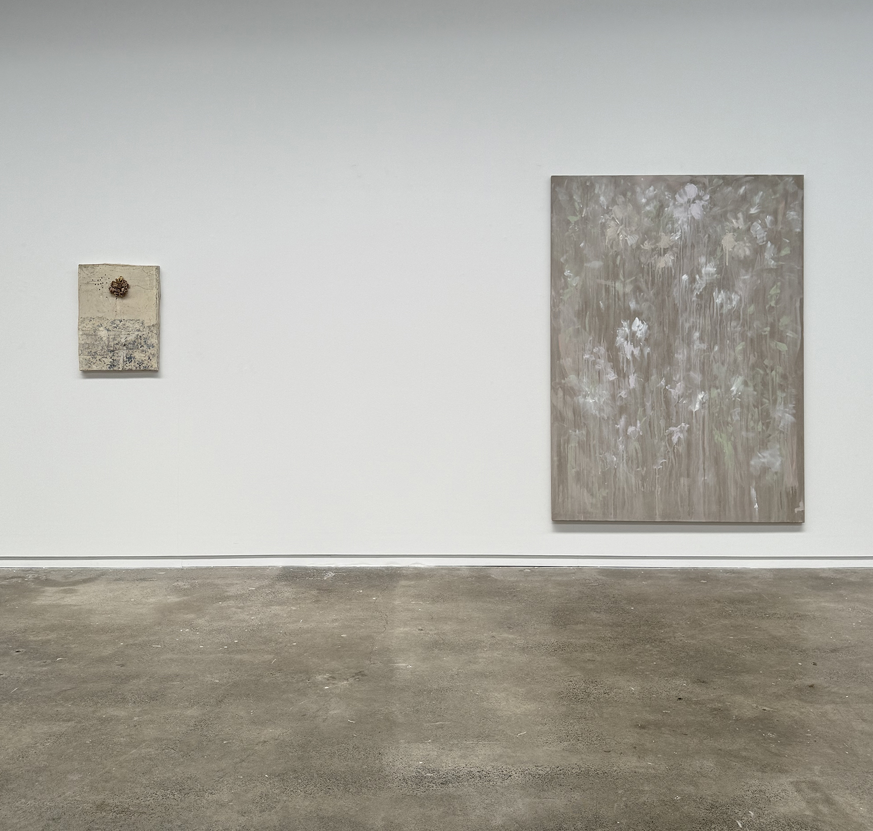 Lawrence Carroll’s Untitled 2014-17 will always be for Emma and I, one of the most poignant works we have ever presented. We had, on Lawrence’s invitation, journeyed to Bolsena, north of Rome and spent two days in his company, in his studio and in the extended embrace of his wife Lucy. Emma and I were charmed by them, by Lawrence, his humour, his ease and his insight – smitten by his work… and we remain so. Lawrence’s raw Arte Povera aesthetic cut a fresh and rough-hewn track right through the centre of our gallery. Then like a daylily he was gone. What we have in his absence is a sublime yet modest collage of the scavenging brilliance of Carroll. Flimsy cotton, plastic flowers and housepaint… no fine cedar stretchers here, no crisp folds of linen but there is everything one could ever desire and it exists to us as a memento vivere.