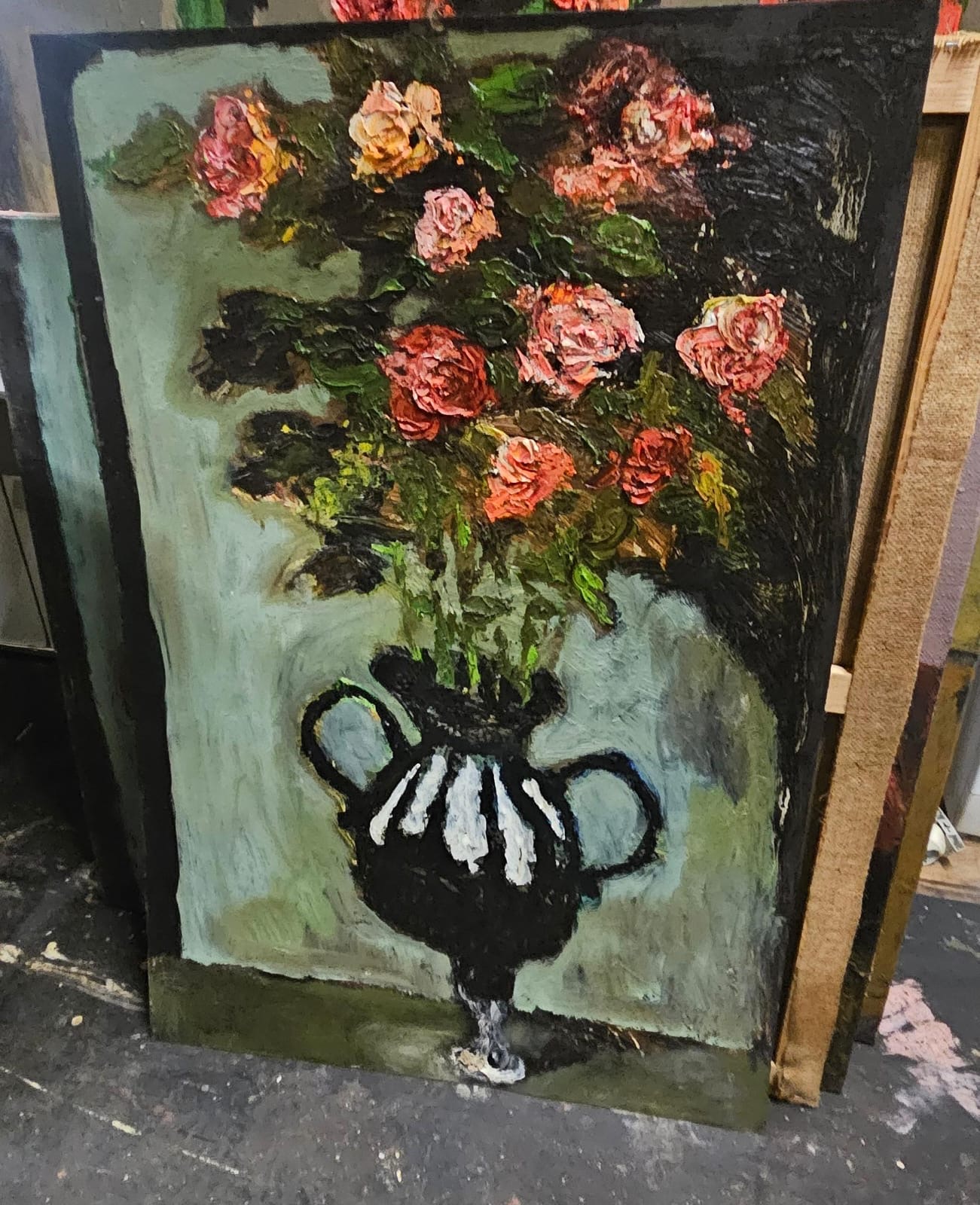 And then there are the paintings of Niyaz Najafov. The antithesis to Raffaella’s delicacy and Rubin’s knowing observation. These full force paintings explode into existence. If Bianca’s paintings are on the edge of visibility, these are simply on the edge. These paintings are over-ripe, fecund, roiling with psychological vandalism. But amidst the intensity there is humour, doubtless dark but humour nonetheless. Niyaz’s flowers are dangerous, Triffid-like… cousins of Seymour’s demanding Venus flytrap in Little Shop of Horrors… stand close if you dare. Once the theatre of the work is understood then we are free to revel in the Soutine-like temerity of the pigment and the brushwork. There is no doubt that Najafov can draw, for his agitated line is crucial to the work, but it is the way that he masses pigment, pushing and tormenting it until it feels as if it could never have emerged from a tube, all smooth and alluringly viscous, that is most captivating.
