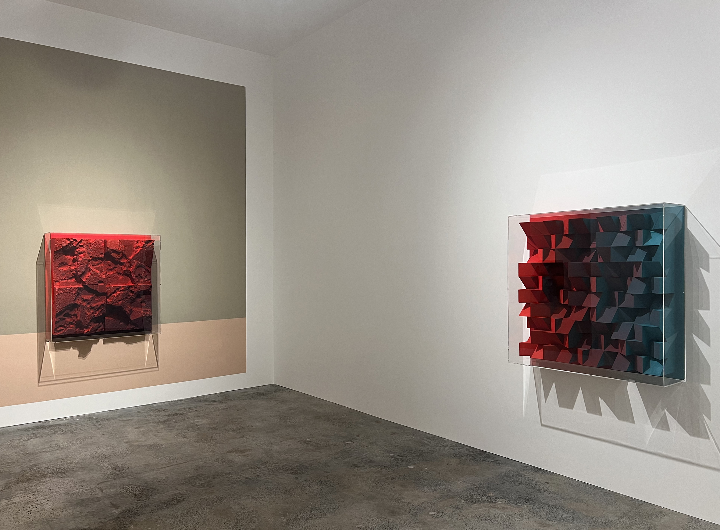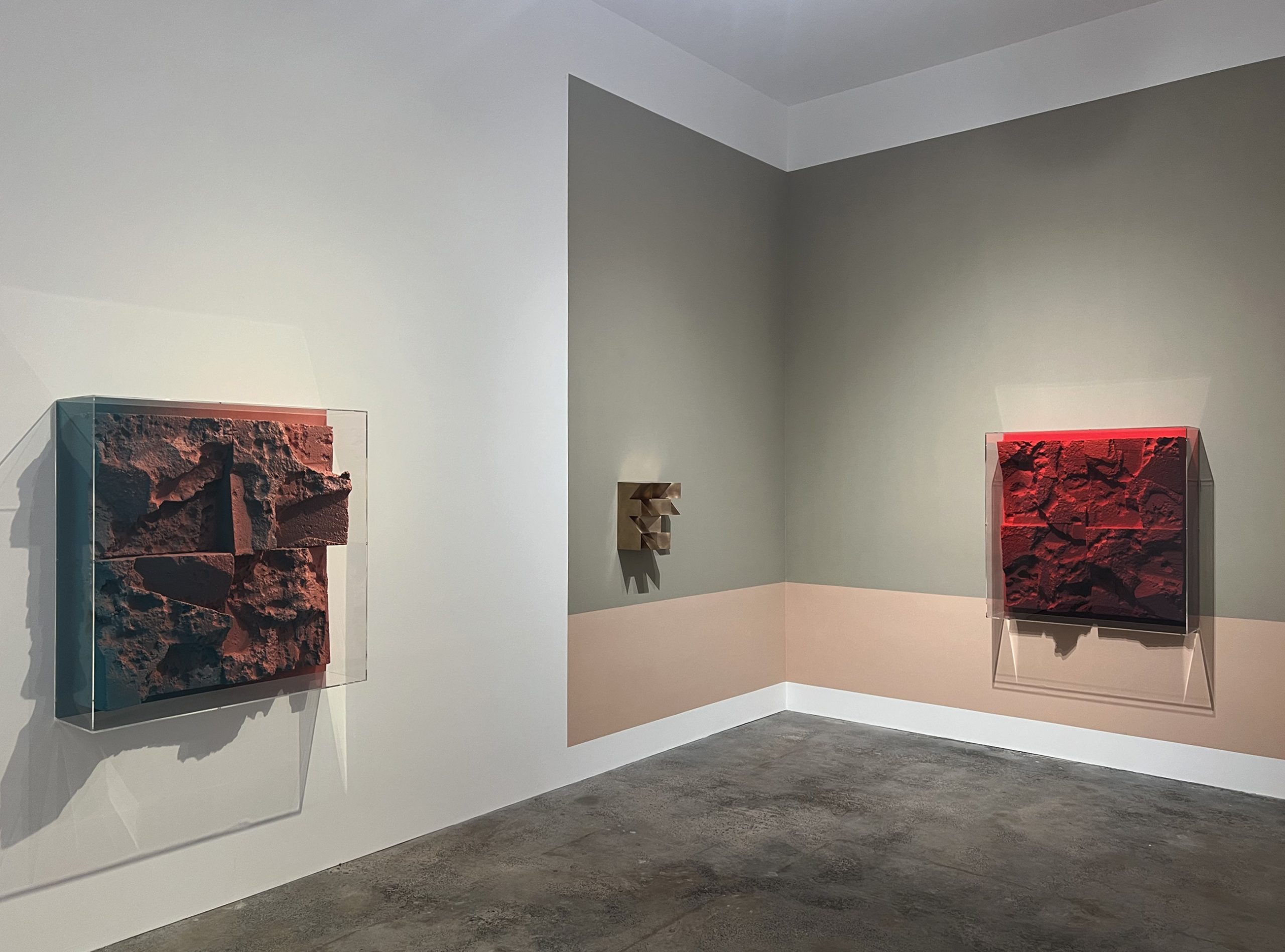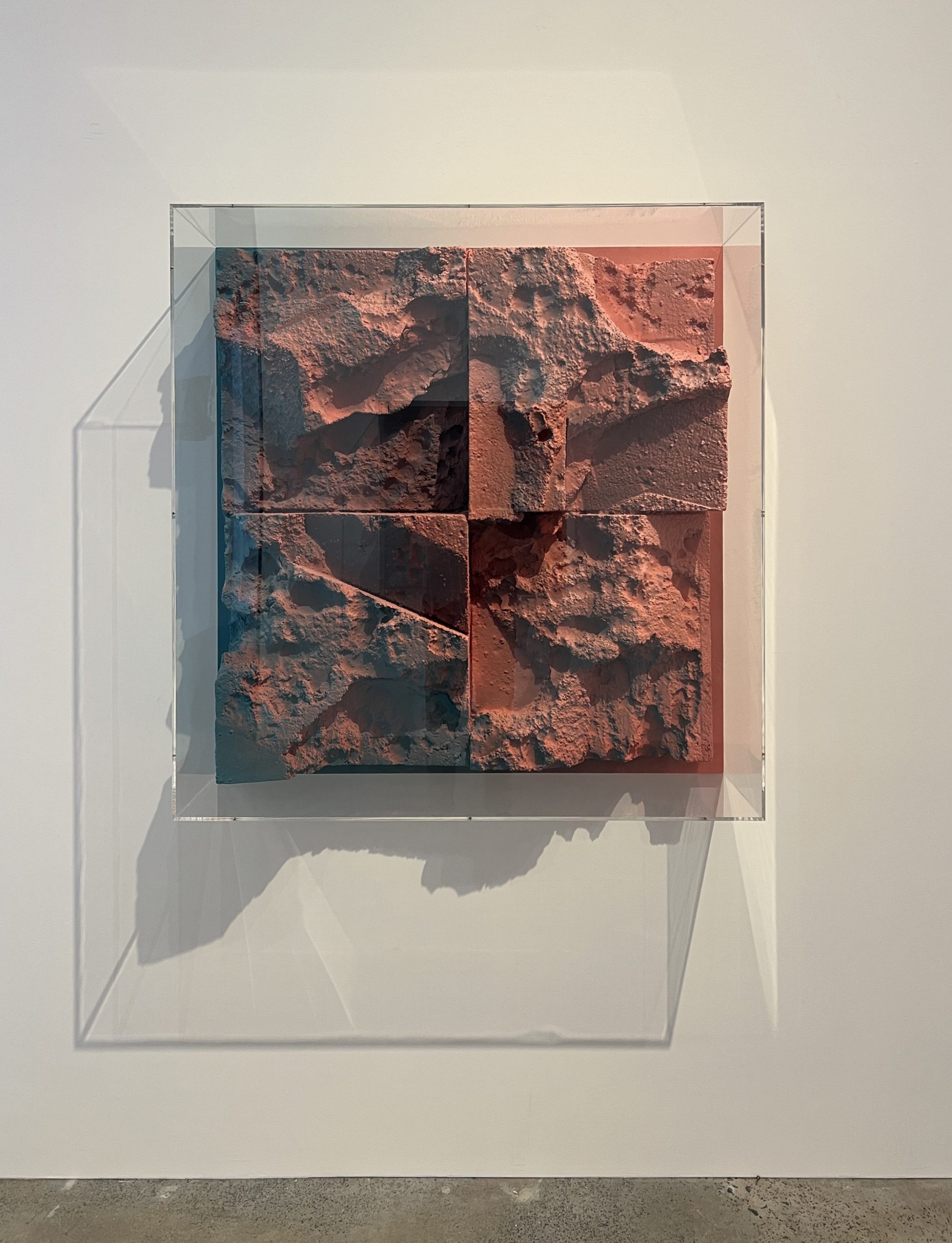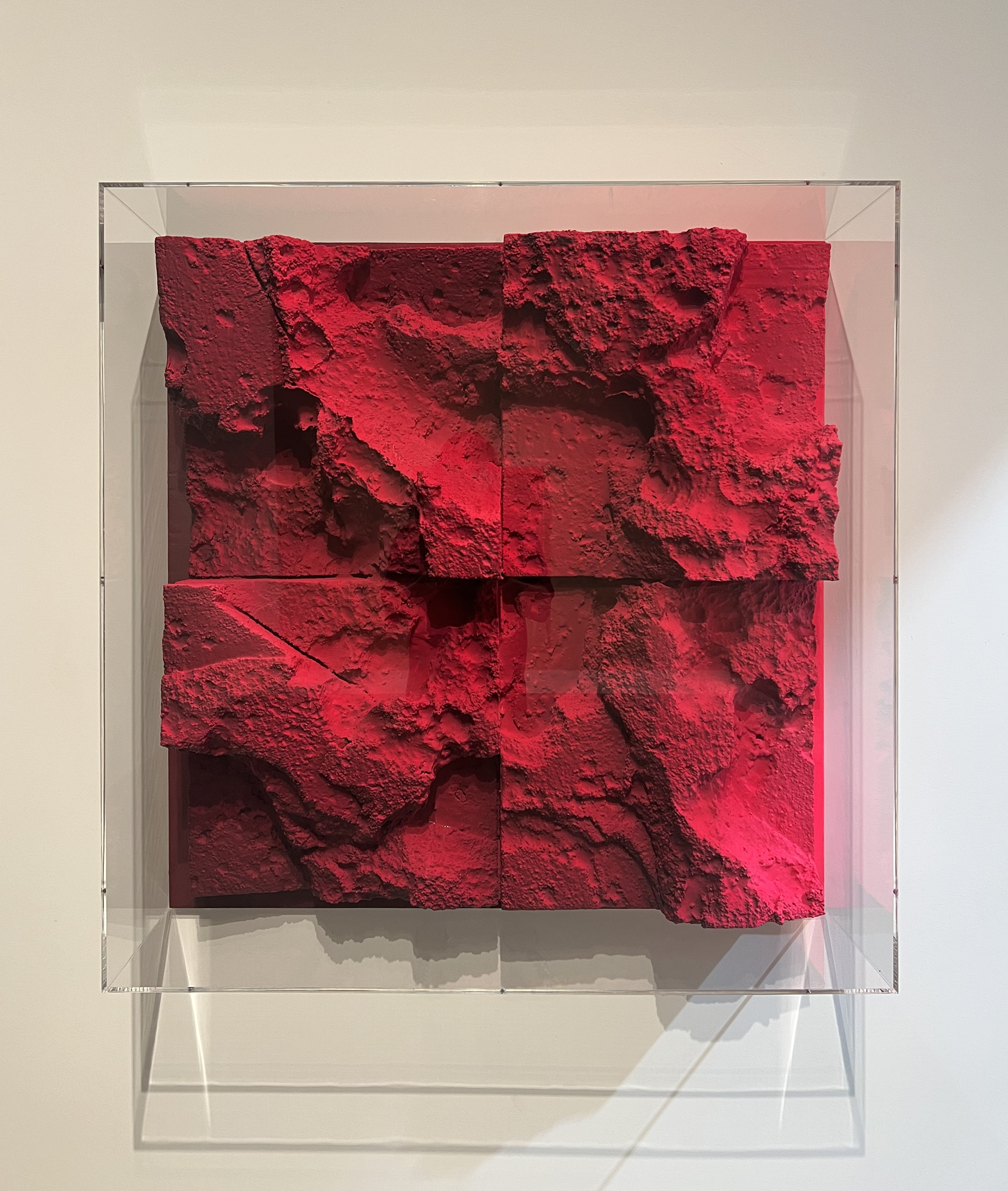It is hard not to see Jan Albers’ grand chainsaw massacre works as fragment of a wall, be it Berlin or another. The sense of them being a geological remnant, a fragment from an earlier brutalist age is strong. His decision to enclose them in a clear Perspex box immediately shifts our perception of them from rubble to relic. The notion that an object might magically morph from raw or ‘found’ status to conceptual/aesthetic object by virtue of context is not new, of course. And though Albers certainly isn’t taking up the mantra of Dada, as a student at the Kunst Académie Dusseldorf, he adopted a post-punk approach to authority, and indeed to painting, preferring to cut, burn and even chain-saw his forms. Whilst these are sculptures that allude to mysterious artifacts, their repeated architectonic compositions, especially in the “wedges” imbues them with a crisper, even classical formality. Albers might’ve resisted the protocols of painting, certainly the ceremony of neatly folding linen corners, especially when the allure of setting to with a chainsaw or a flame-thrower beckoned. But what he couldn’t quite set aside were the fundamental attractions of colour and light. In this sense he is just as much a disciple of Monet as Duchamp…. Impressionism meets the concrete block.