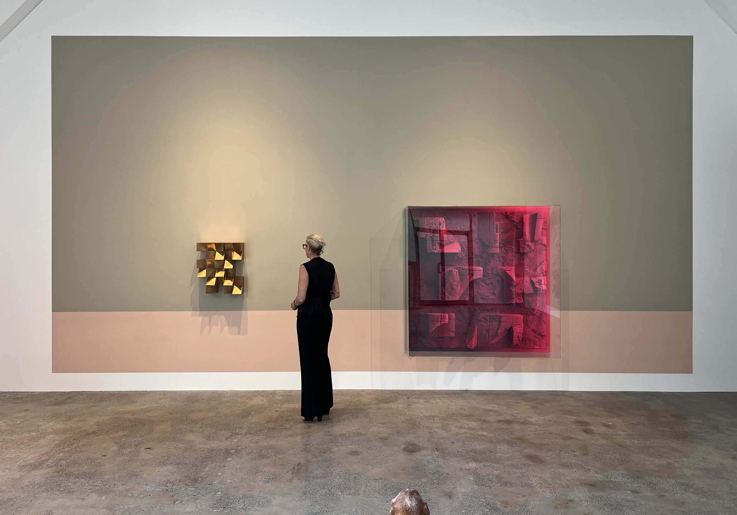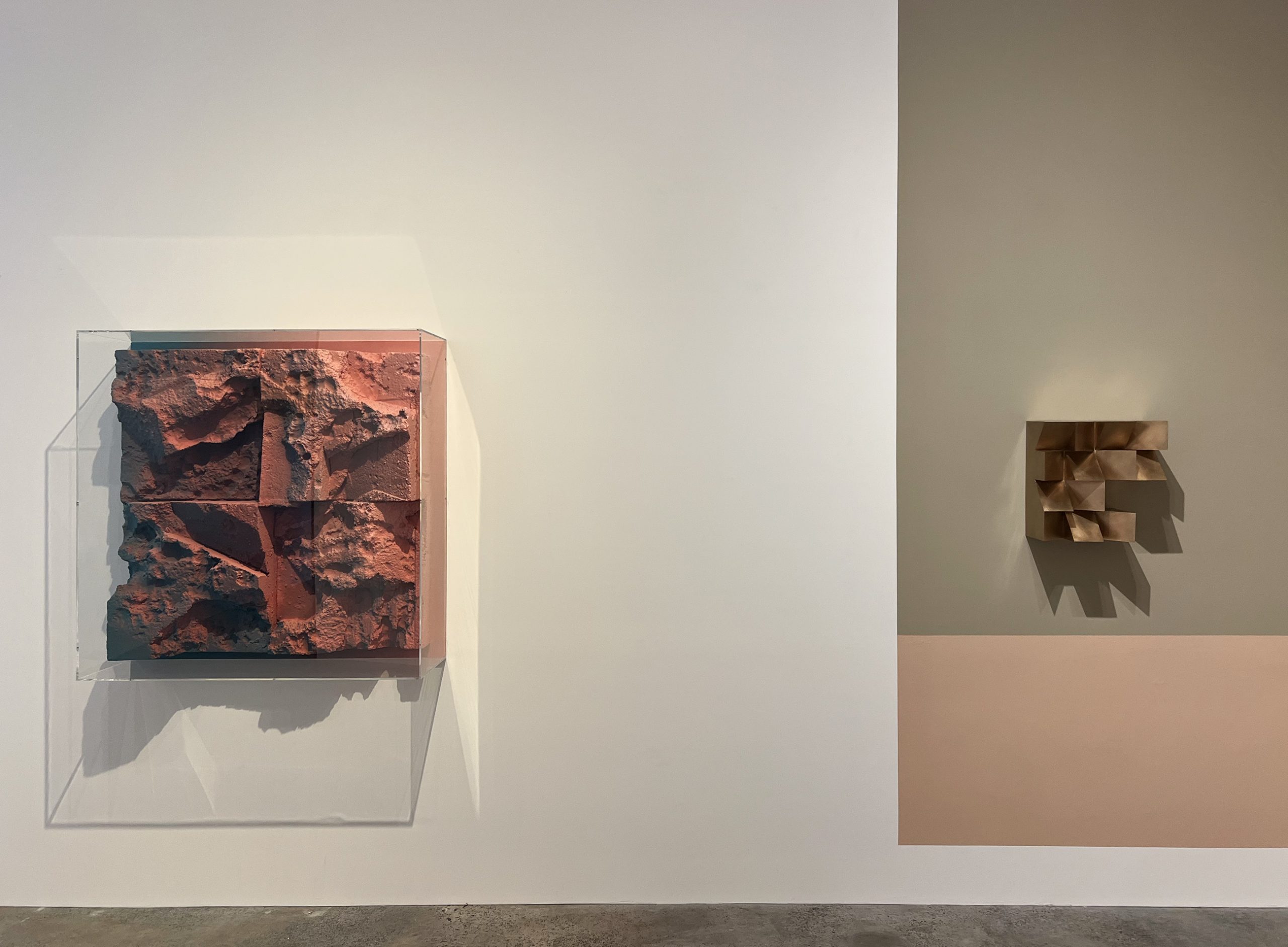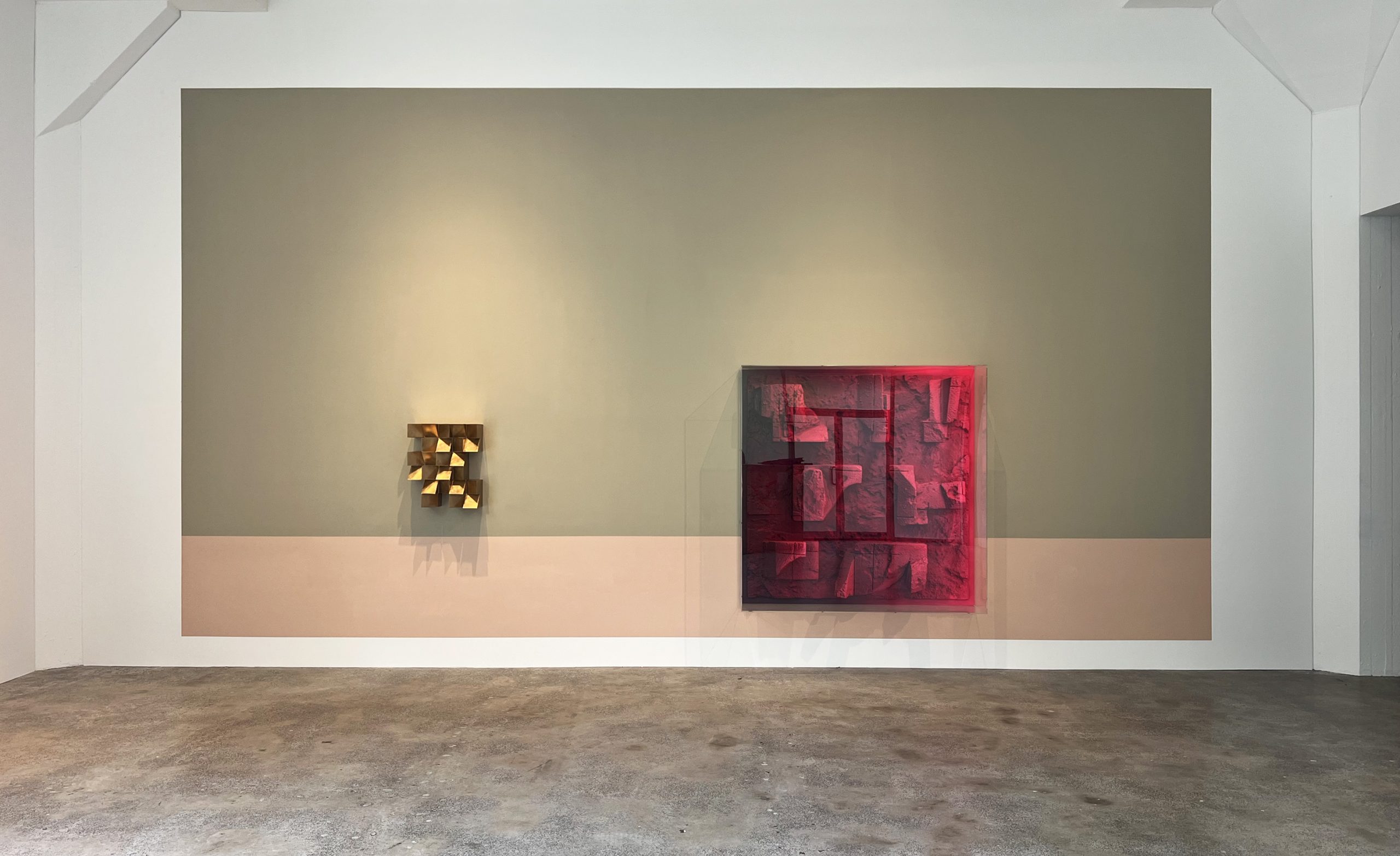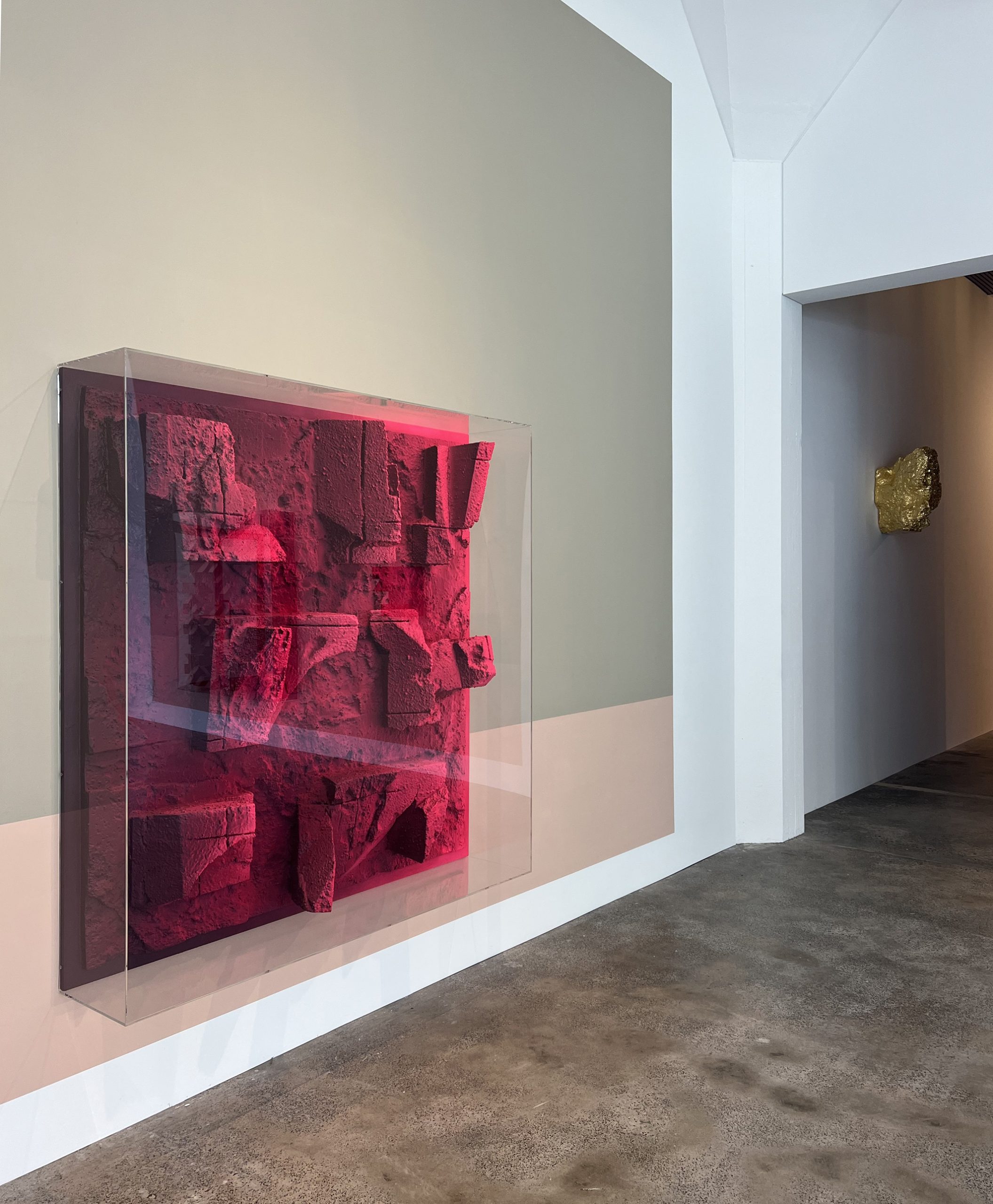 It is hard not to see Jan Albers’ grand chainsaw massacre works as fragment of a wall, be it Berlin or another. The sense of them being a geological remnant, a fragment from an earlier brutalist age is strong. His decision to enclose them in a clear Perspex box immediately shifts our perception of them from rubble to relic. The notion that an object might magically morph from raw or ‘found’ status to conceptual/aesthetic object by virtue of context is not new, of course. And though Albers certainly isn’t taking up the mantra of Dada, as a student at the Kunst Académie Dusseldorf, he adopted a post-punk approach to authority, and indeed to painting, preferring to cut, burn and even chain-saw his forms. Whilst these are sculptures that allude to mysterious artifacts, their repeated architectonic compositions, especially in the “wedges” imbues them with a crisper, even classical formality. Albers might’ve resisted the protocols of painting, certainly the ceremony of neatly folding linen corners, especially when the allure of setting to with a chainsaw or a flame-thrower beckoned. But what he couldn’t quite set aside were the fundamental attractions of colour and light. In this sense he is just as much a disciple of Monet as Duchamp…. Impressionism meets the concrete block.