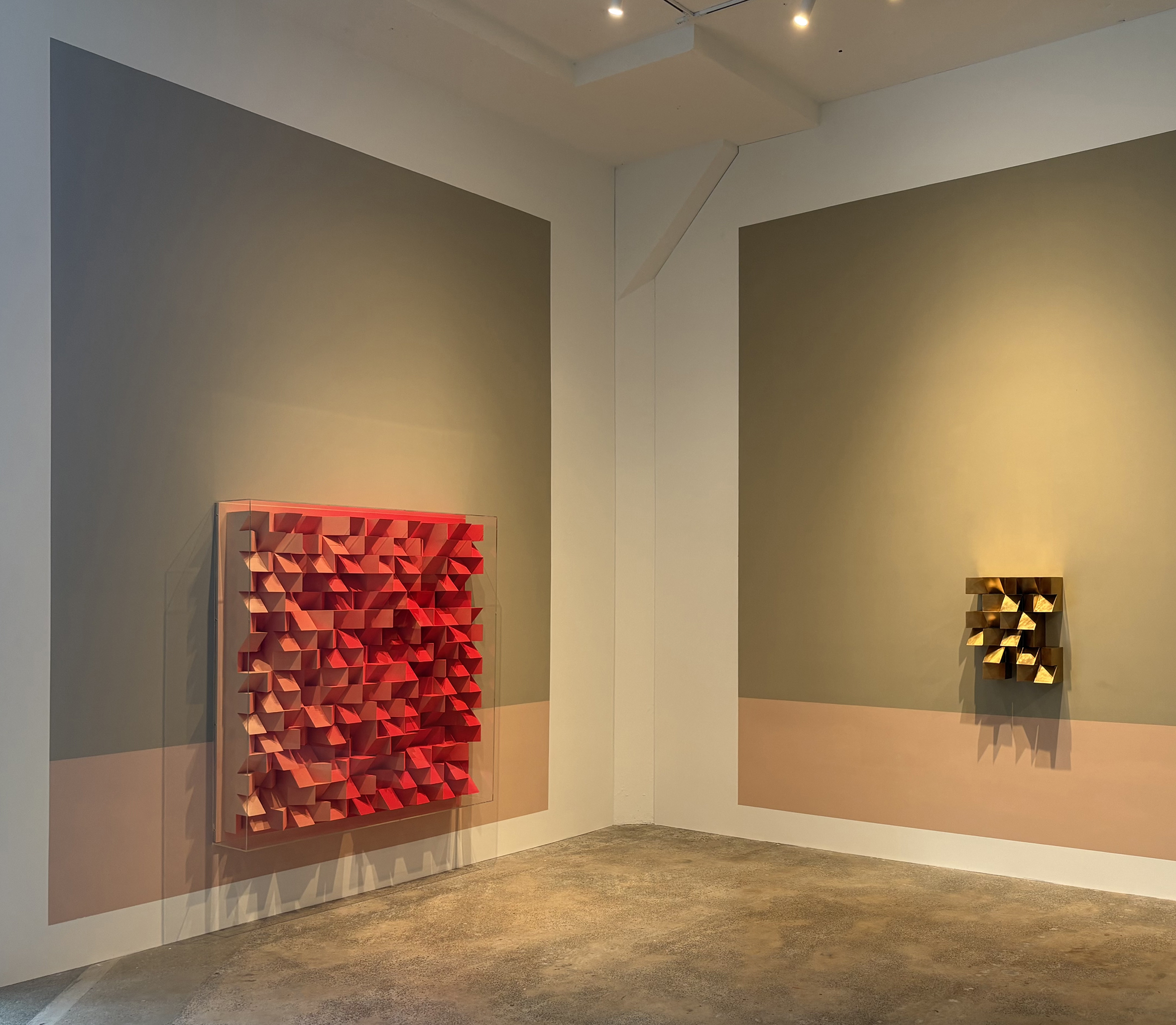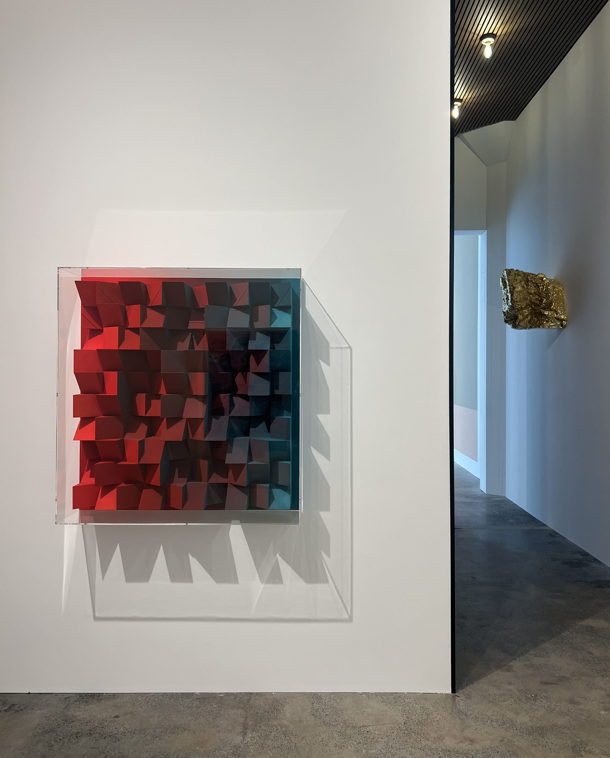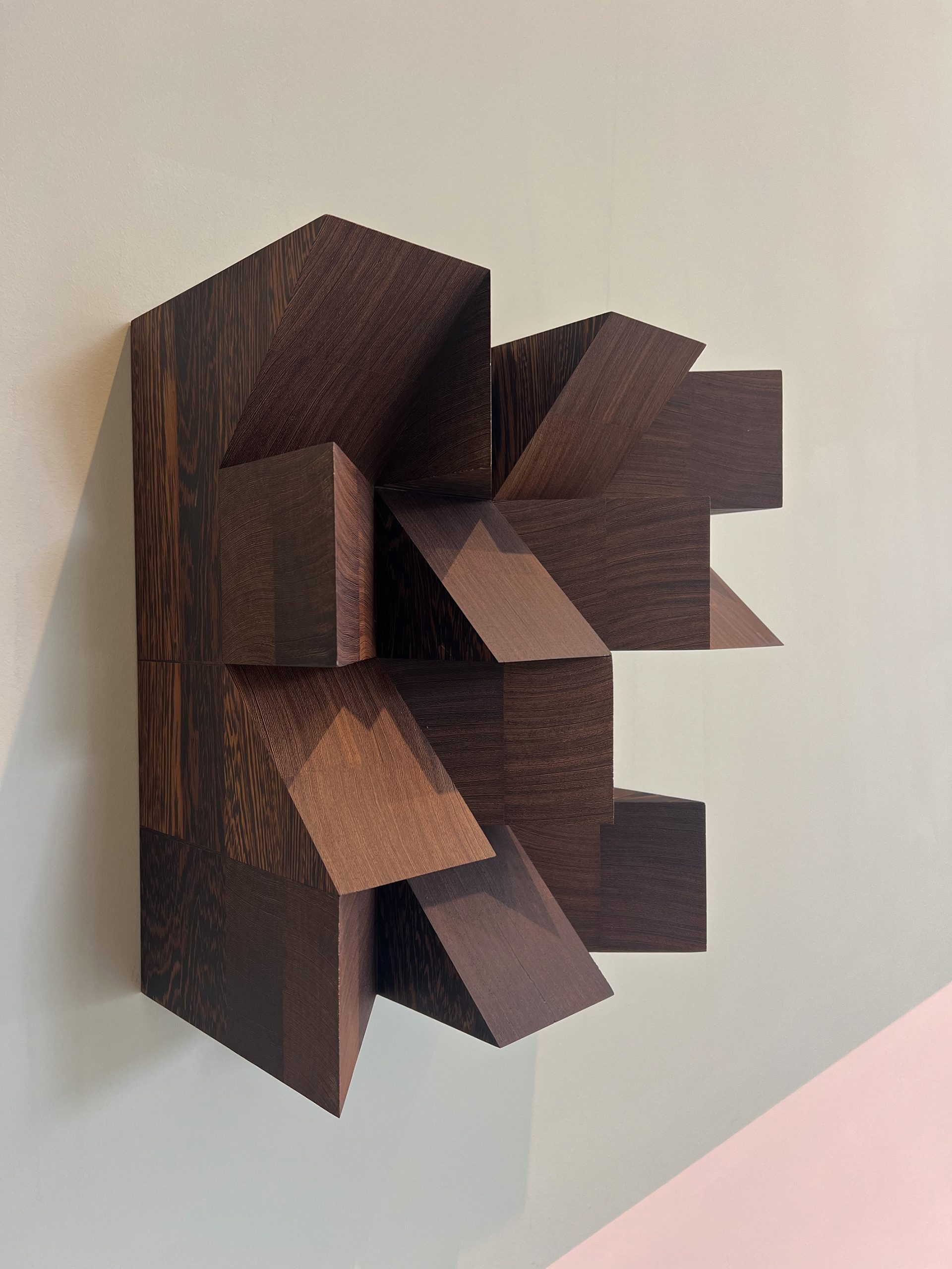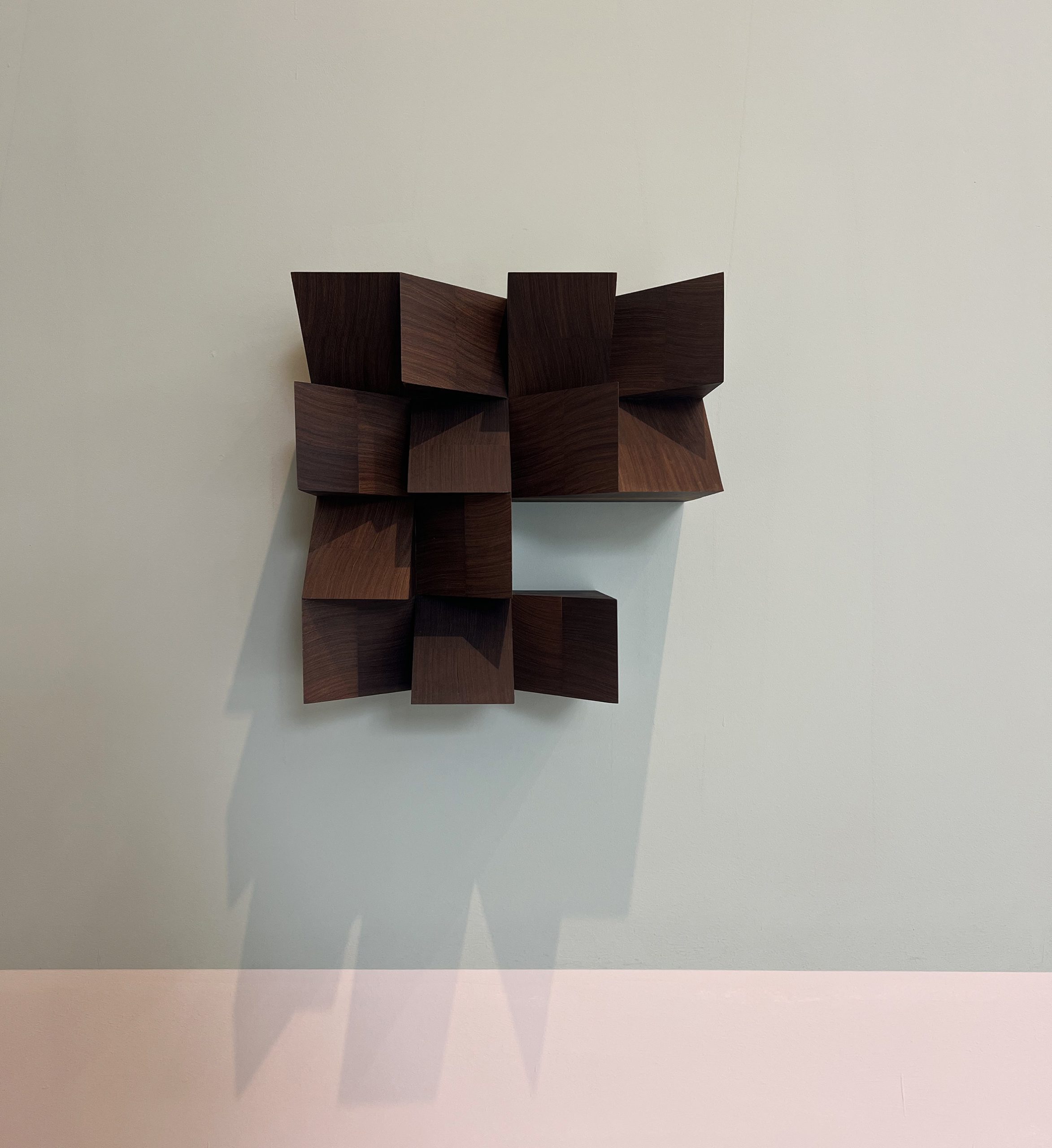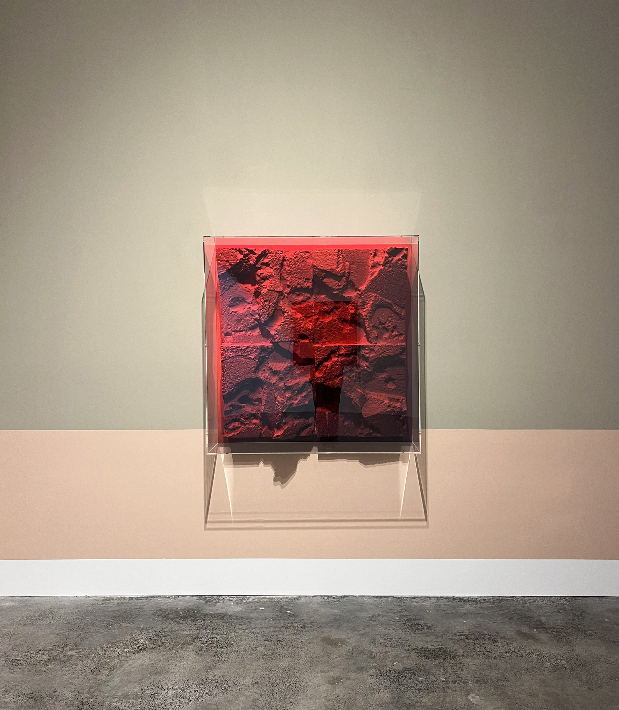 It is hard not to see Jan Albers’ grand chainsaw massacre works as fragment of a wall, be it Berlin or another. The sense of them being a geological remnant, a fragment from an earlier brutalist age is strong. His decision to enclose them in a clear Perspex box immediately shifts our perception of them from rubble to relic. The notion that an object might magically morph from raw or ‘found’ status to conceptual/aesthetic object by virtue of context is not new, of course. And though Albers certainly isn’t taking up the mantra of Dada, as a student at the Kunst Académie Dusseldorf, he adopted a post-punk approach to authority, and indeed to painting, preferring to cut, burn and even chain-saw his forms. Whilst these are sculptures that allude to mysterious artifacts, their repeated architectonic compositions, especially in the “wedges” imbues them with a crisper, even classical formality. Albers might’ve resisted the protocols of painting, certainly the ceremony of neatly folding linen corners, especially when the allure of setting to with a chainsaw or a flame-thrower beckoned. But what he couldn’t quite set aside were the fundamental attractions of colour and light. In this sense he is just as much a disciple of Monet as Duchamp…. Impressionism meets the concrete block.