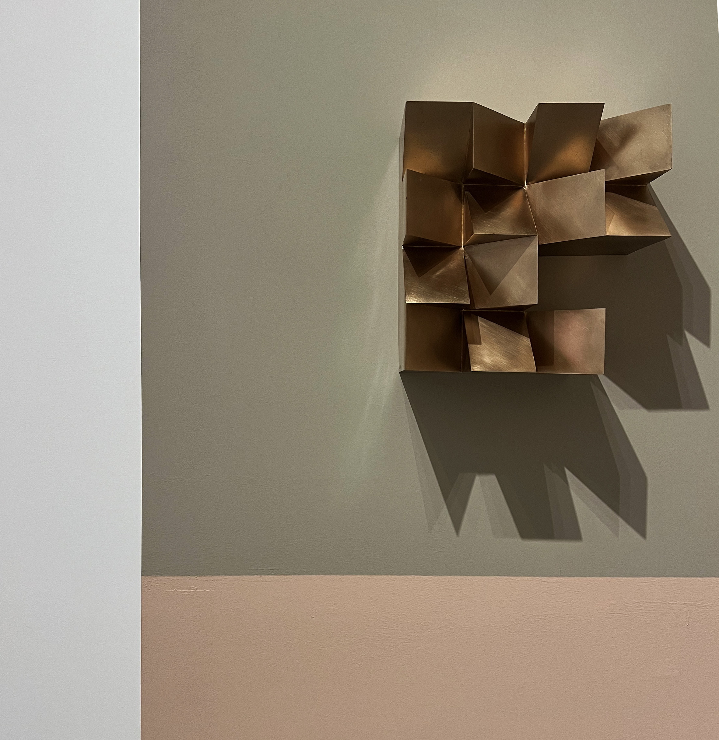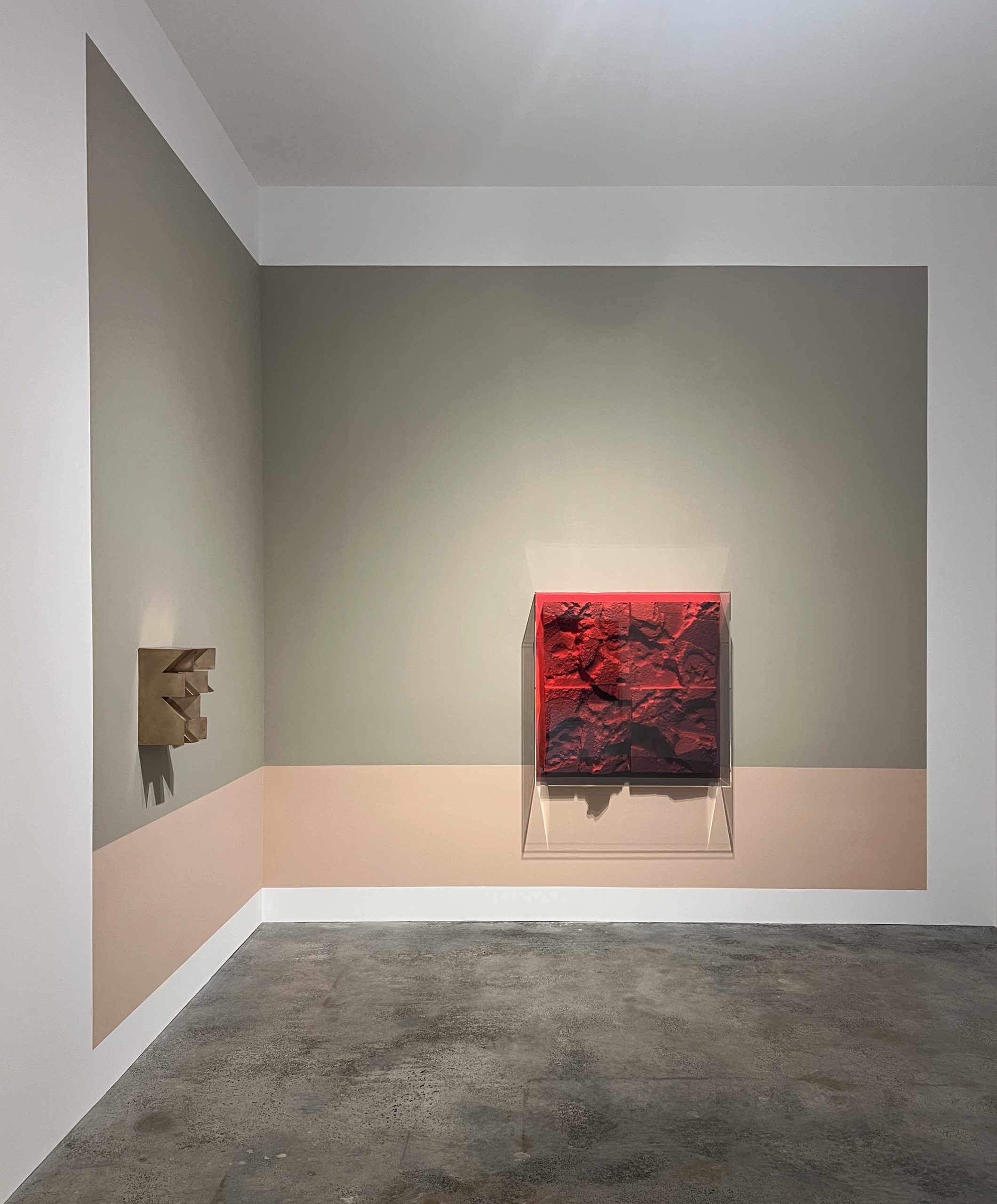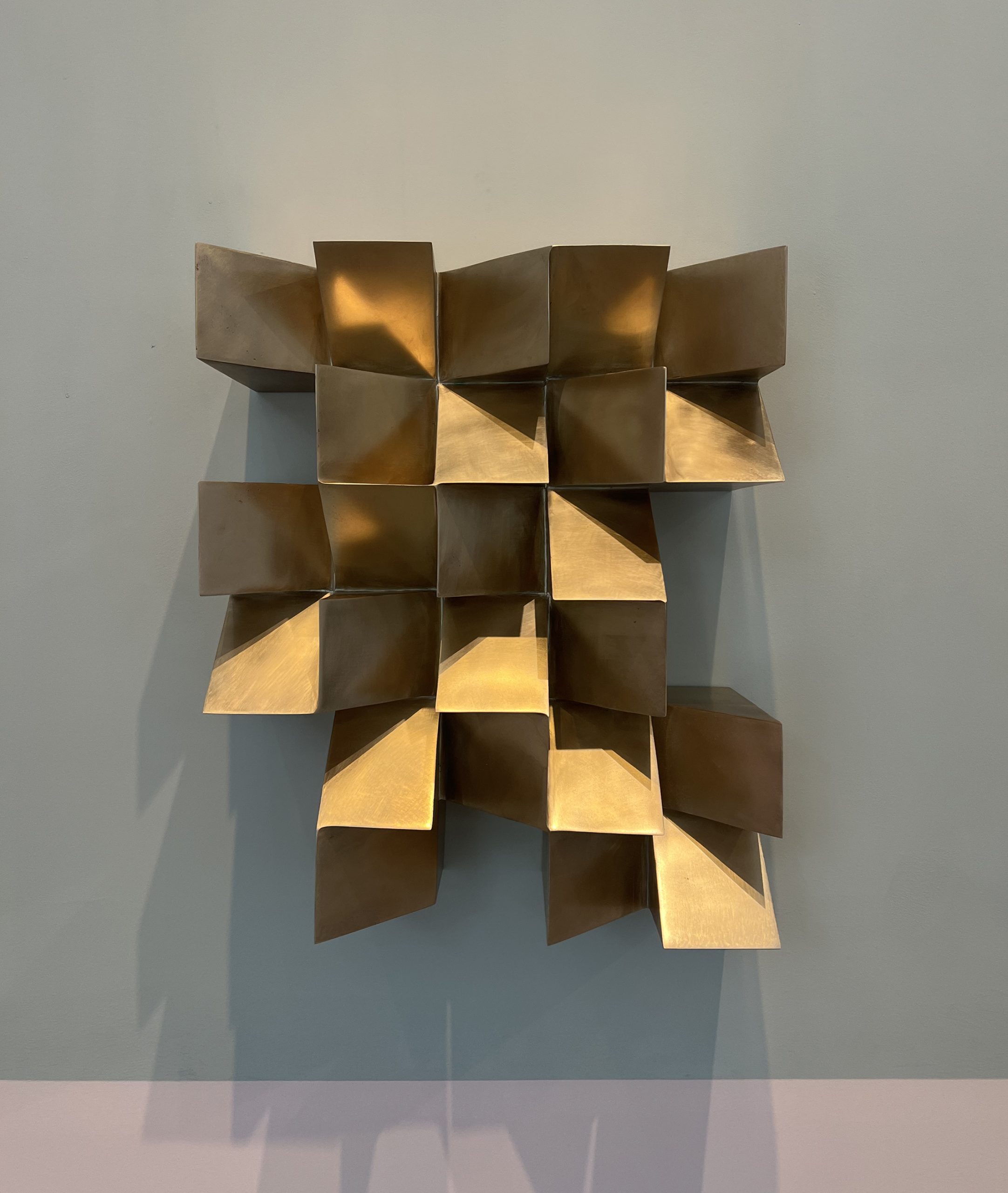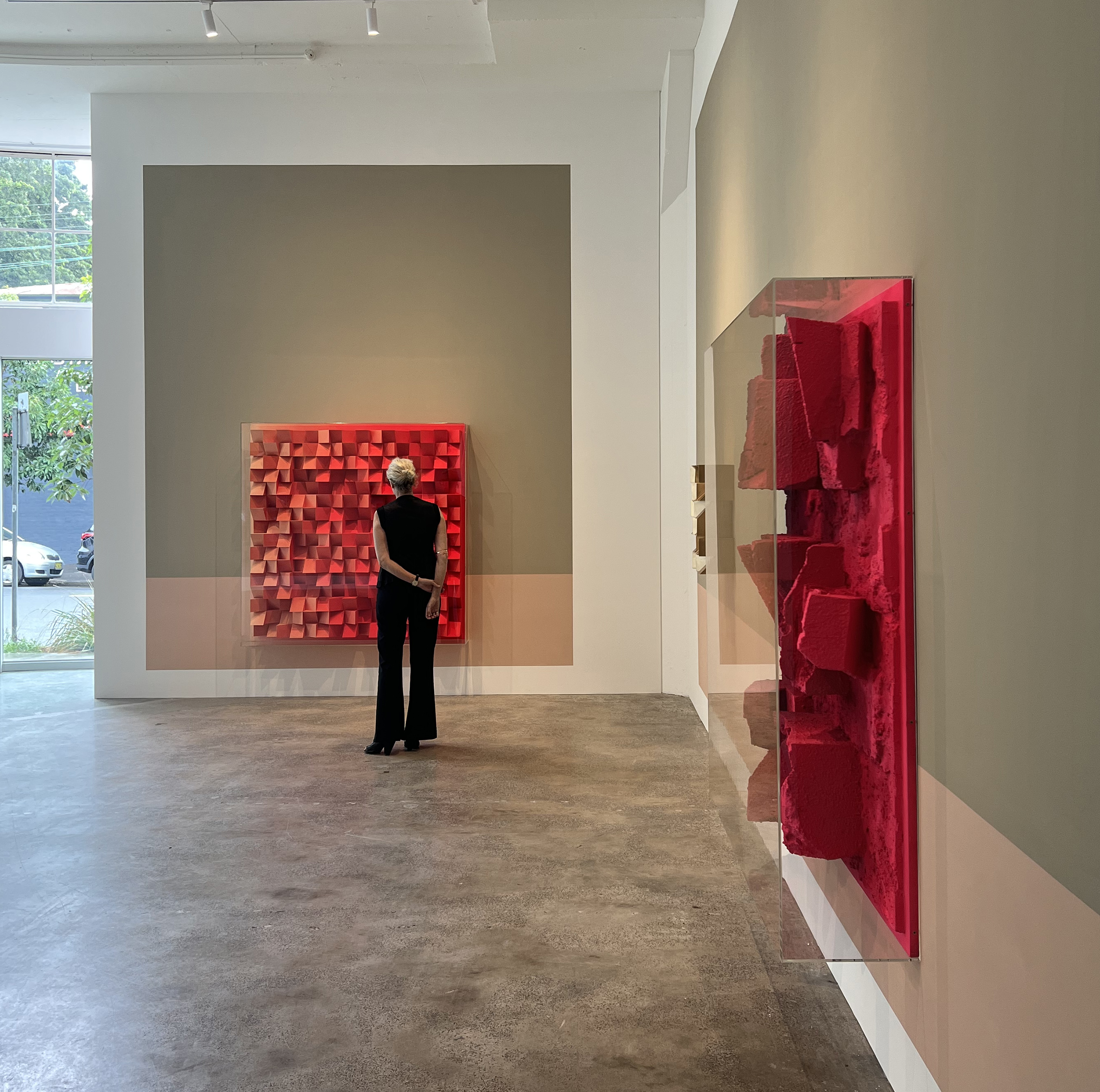 It is hard not to see Jan Albers’ grand chainsaw massacre works as fragment of a wall, be it Berlin or another. The sense of them being a geological remnant, a fragment from an earlier brutalist age is strong. His decision to enclose them in a clear Perspex box immediately shifts our perception of them from rubble to relic. The notion that an object might magically morph from raw or ‘found’ status to conceptual/aesthetic object by virtue of context is not new, of course. And though Albers certainly isn’t taking up the mantra of Dada, as a student at the Kunst Académie Dusseldorf, he adopted a post-punk approach to authority, and indeed to painting, preferring to cut, burn and even chain-saw his forms. Whilst these are sculptures that allude to mysterious artifacts, their repeated architectonic compositions, especially in the “wedges” imbues them with a crisper, even classical formality. Albers might’ve resisted the protocols of painting, certainly the ceremony of neatly folding linen corners, especially when the allure of setting to with a chainsaw or a flame-thrower beckoned. But what he couldn’t quite set aside were the fundamental attractions of colour and light. In this sense he is just as much a disciple of Monet as Duchamp…. Impressionism meets the concrete block.