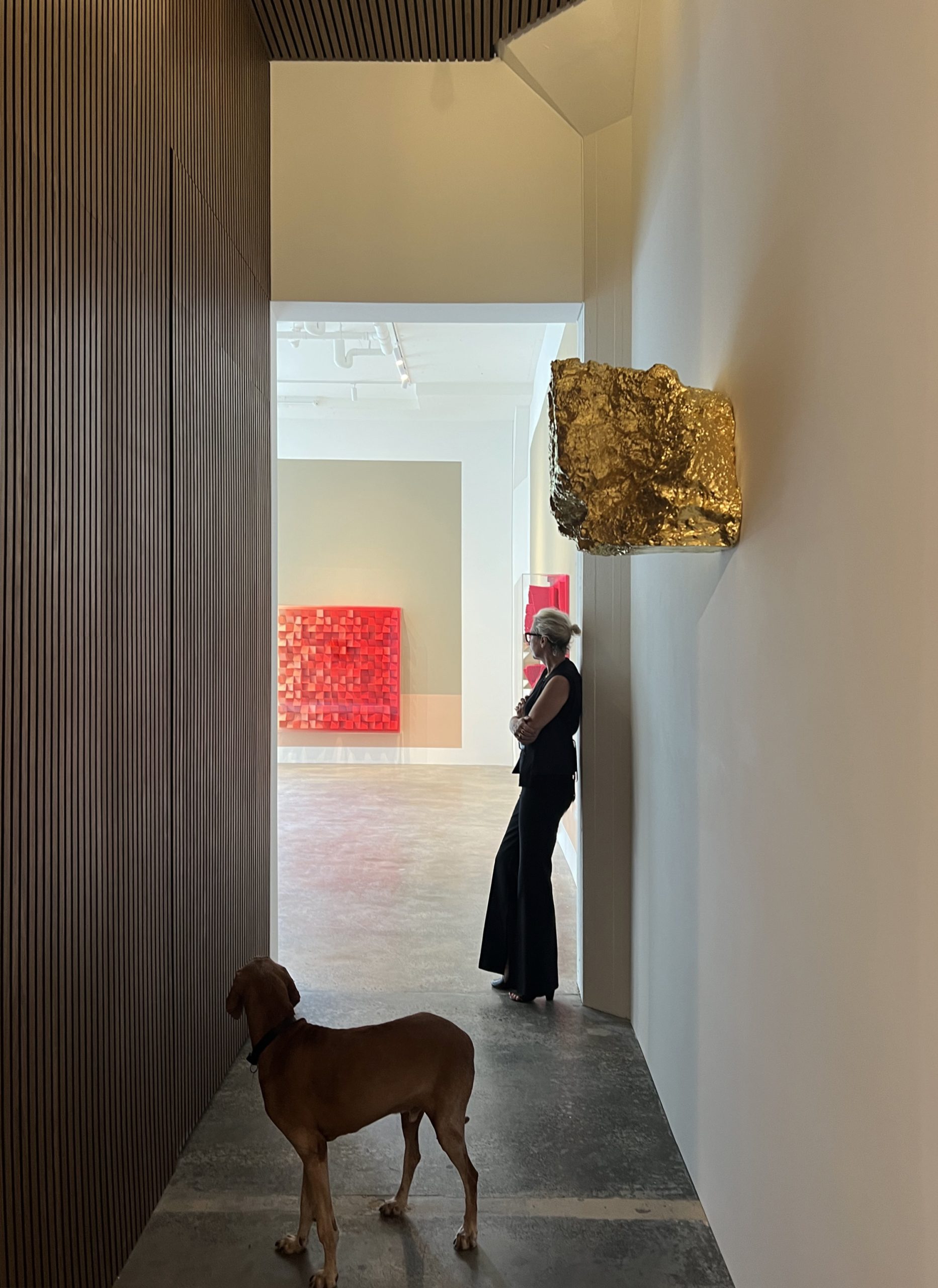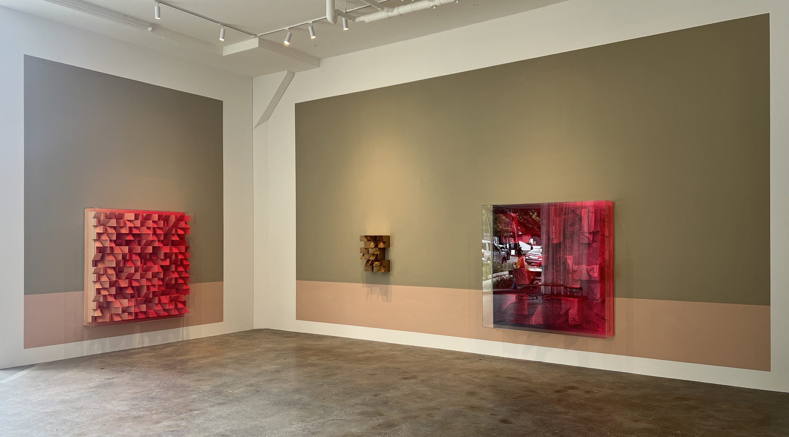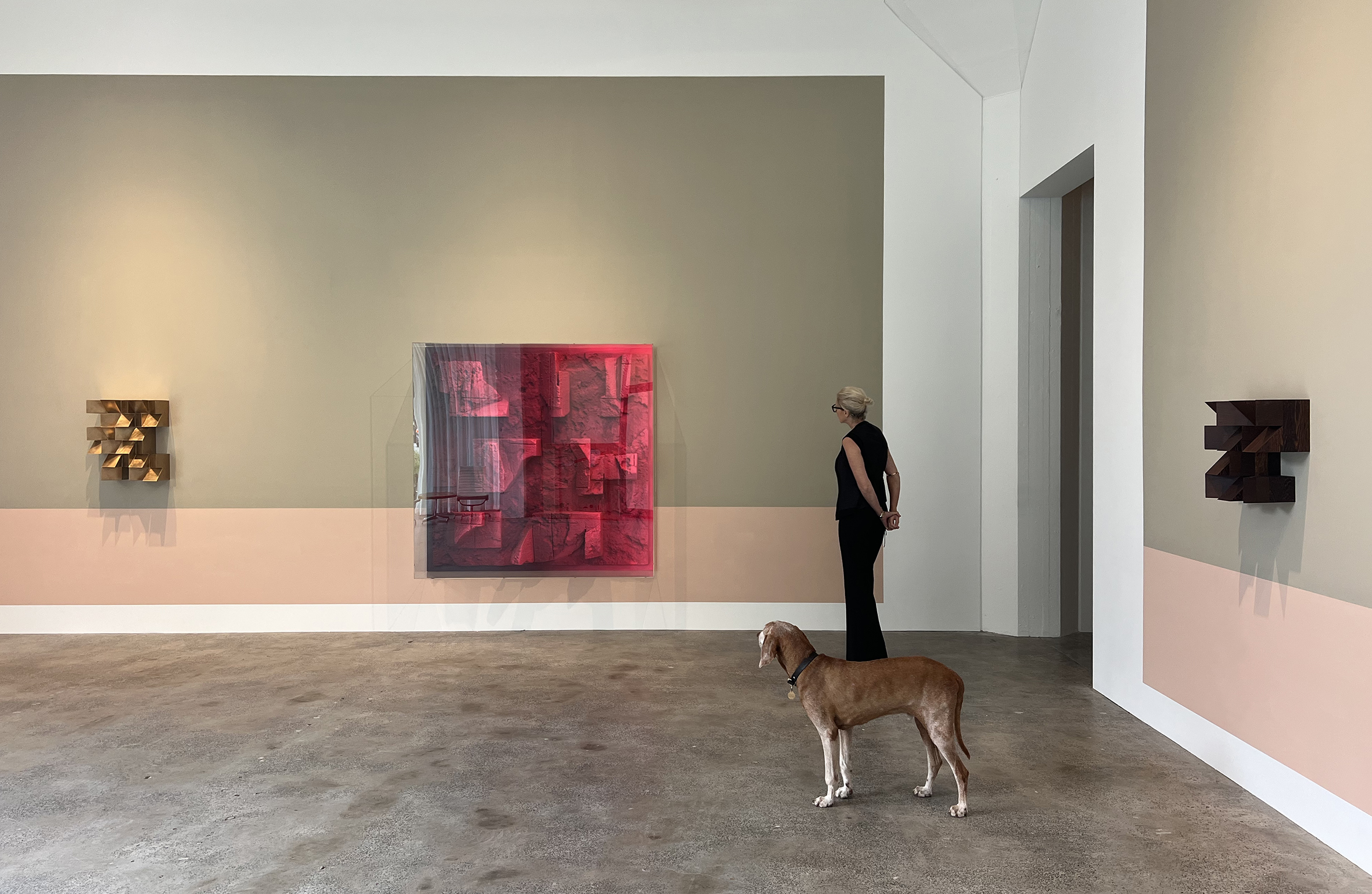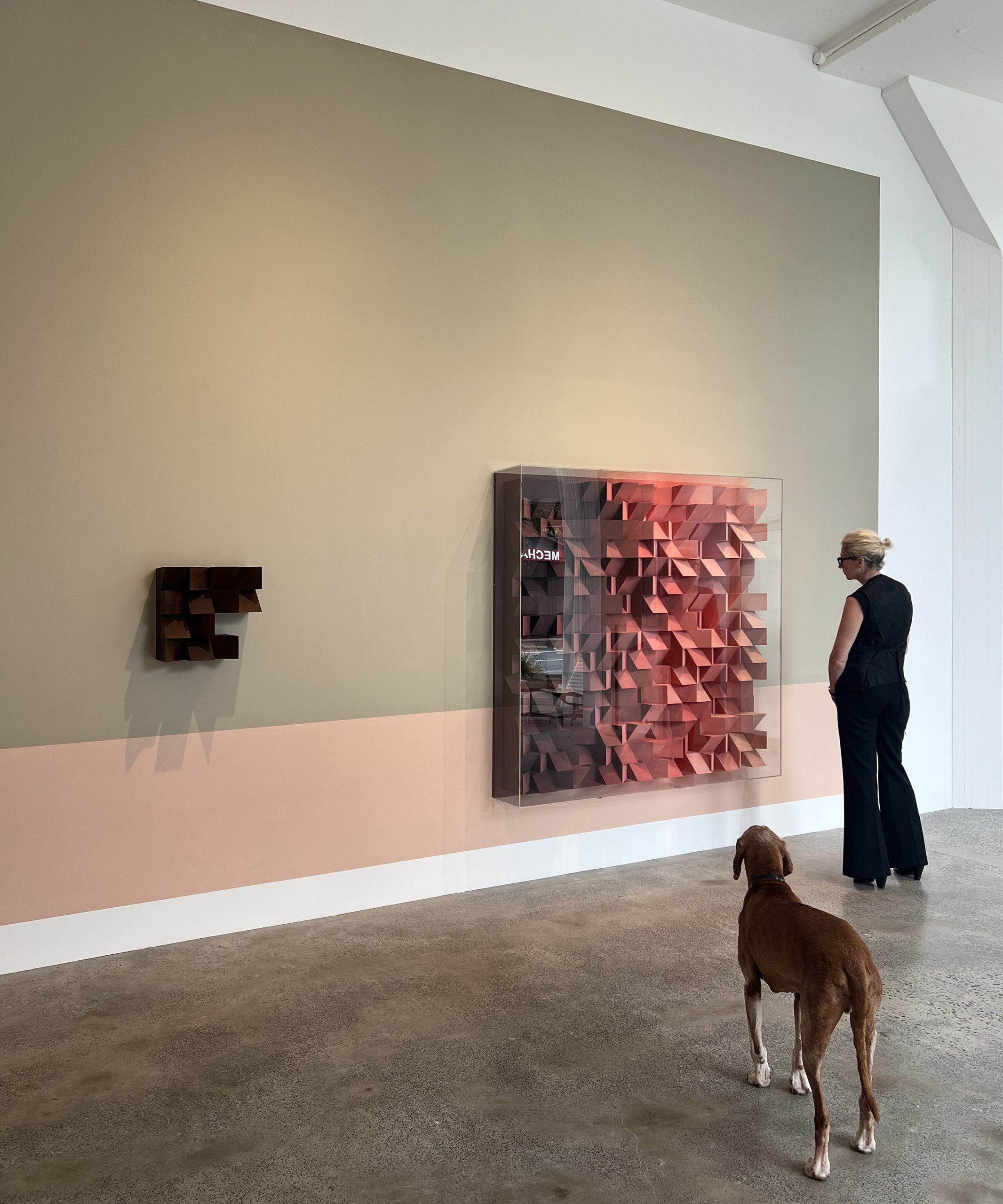 It is hard not to see Jan Albers’ grand chainsaw massacre works as fragment of a wall, be it Berlin or another. The sense of them being a geological remnant, a fragment from an earlier brutalist age is strong. His decision to enclose them in a clear Perspex box immediately shifts our perception of them from rubble to relic. The notion that an object might magically morph from raw or ‘found’ status to conceptual/aesthetic object by virtue of context is not new, of course. And though Albers certainly isn’t taking up the mantra of Dada, as a student at the Kunst Académie Dusseldorf, he adopted a post-punk approach to authority, and indeed to painting, preferring to cut, burn and even chain-saw his forms. Whilst these are sculptures that allude to mysterious artifacts, their repeated architectonic compositions, especially in the “wedges” imbues them with a crisper, even classical formality. Albers might’ve resisted the protocols of painting, certainly the ceremony of neatly folding linen corners, especially when the allure of setting to with a chainsaw or a flame-thrower beckoned. But what he couldn’t quite set aside were the fundamental attractions of colour and light. In this sense he is just as much a disciple of Monet as Duchamp…. Impressionism meets the concrete block.
